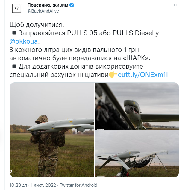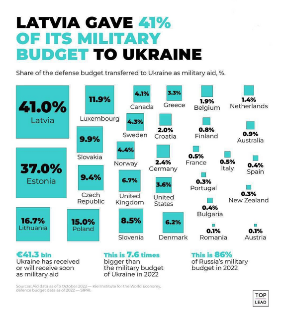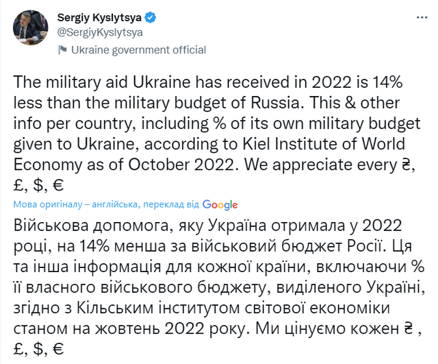 "Військова допомога, яку Україна отримала у 2022 році, на 14% менша за військовий бюджет Росії. Ця та інша інформація по країнам, включаючи % їх власного військового бюджету, виділеного Україні, згідно з даними Кільського інституту світової економіки станом на жовтень 2022 року. Ми цінуємо кожну гривню, фунт, долар і євро." ![]() ![]() |